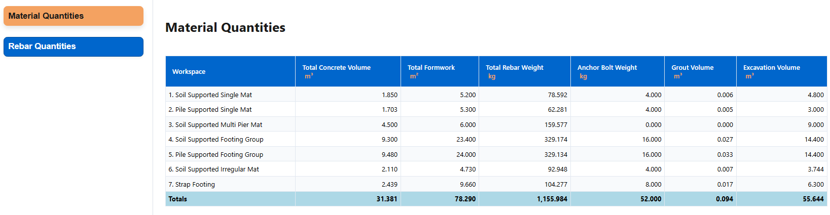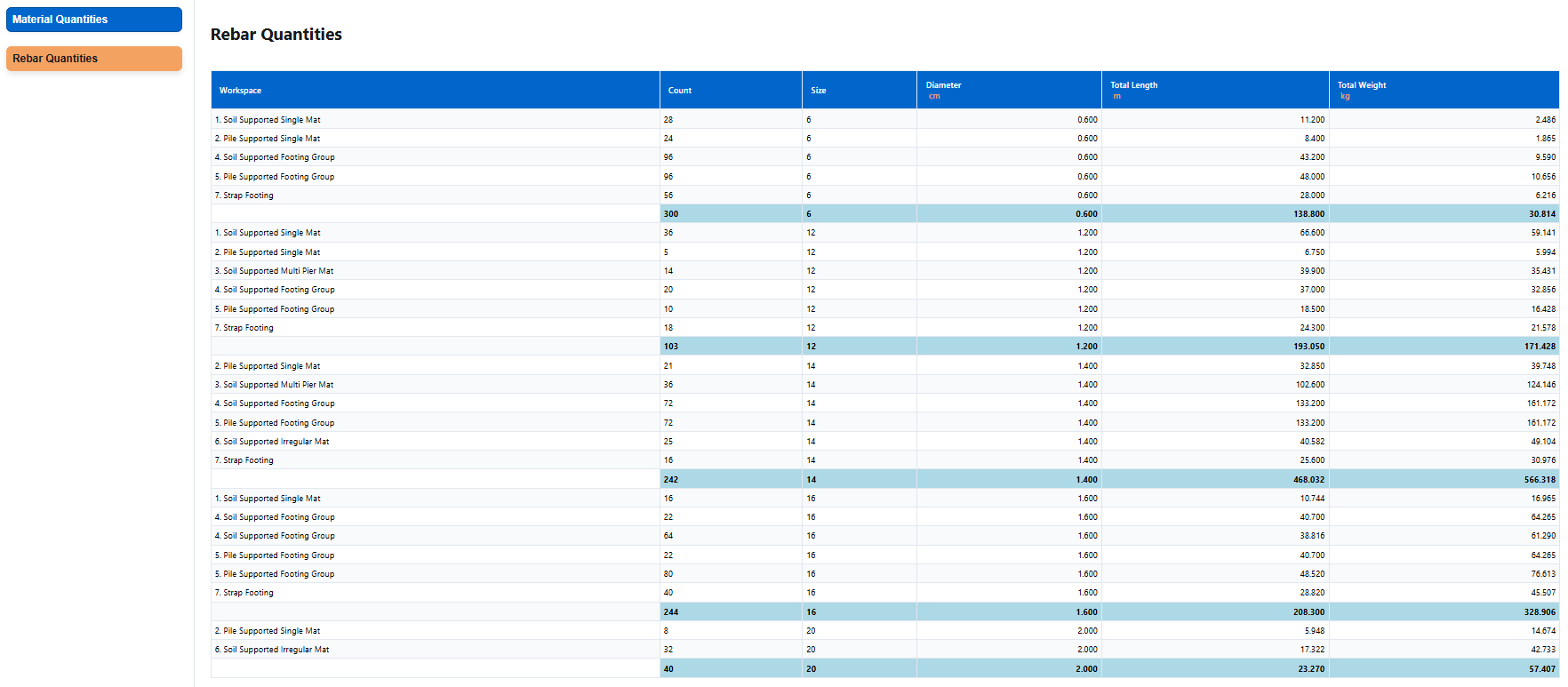 bolt analysis in Foundation3D, Mat3D and Shaft3D. View, use and modify anchor reinforcement required to resist tension breakout failure including development length recommendation - Generate HTML reports – In addition to Microsoft Excel report, generate various types of HTML reports such as aggregate report displaying material quantities of all selected workspaces, various rebar sizes used in all selected workspaces, 3D views including rebar layouts in pedestals and footings, calculation details including pertinent code equations and many more